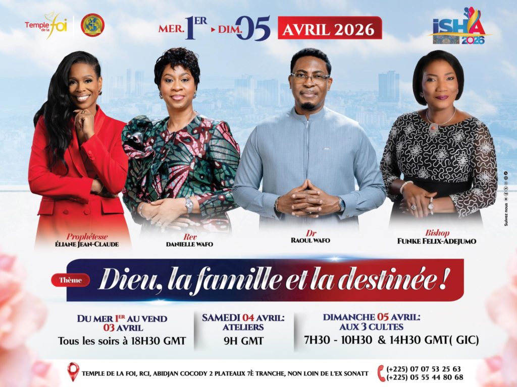 Nous te convions à notre programme annuel dédié à la famille, ISH et ISHA en abrégé ISH’A 2026. RDV au Temple de la Foi, à partir du Mercredi 1er Avril dès 18H30 GMT pour la grande ouverture de cet événement. AU PROGRAMME : Plénières - Temps de Célébration - Ateliers - Panels - Rencontres B to B - Partage et Communion fraternelle. Ne manque surtout pas ces moments si tu désires que Dieu intervienne dans ton couple, dans ton foyer, dans la vie de tes enfants et dans ta grande famille. CONTACT : (+225) 07 07 53 25 63 / 05 55 44 80 68